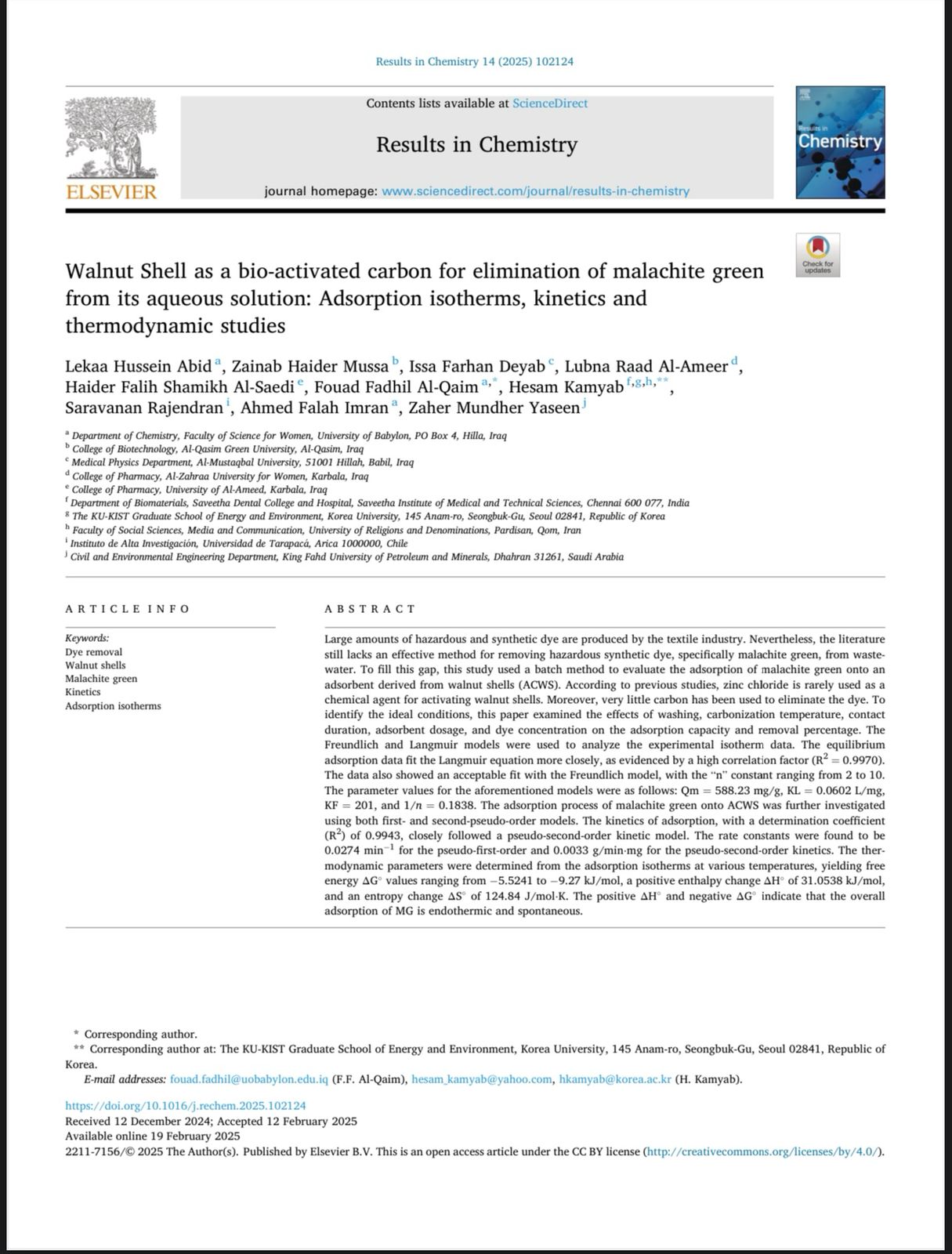 Asst. Lect. Lubna Raad Abd Al-Ameer, a Pharmacy Faculty member at Al-Zahraa University for Women, has published a scientific research paper in Results in Chemistry, a Scopus-indexed (Q3) journal with an impact factor of The study focuses on the development of an adsorbent material derived from walnut shells to remove malachite green dye The study focuses on the development of an adsorbent material derived from walnut shells to remove malachite green dye from industrial wastewater. Malachite green is a hazardous dye commonly used in the textile industry. The research findings revealed that the walnut shell-based adsorbent exhibited high adsorption efficiency, with results closely in conformity with the Langmuir isotherm model. Additionally, kinetic and thermodynamic analyses confirmed that the adsorption process is spontaneous and endothermic, further validating the potential for treating dye-contaminated industrial water.